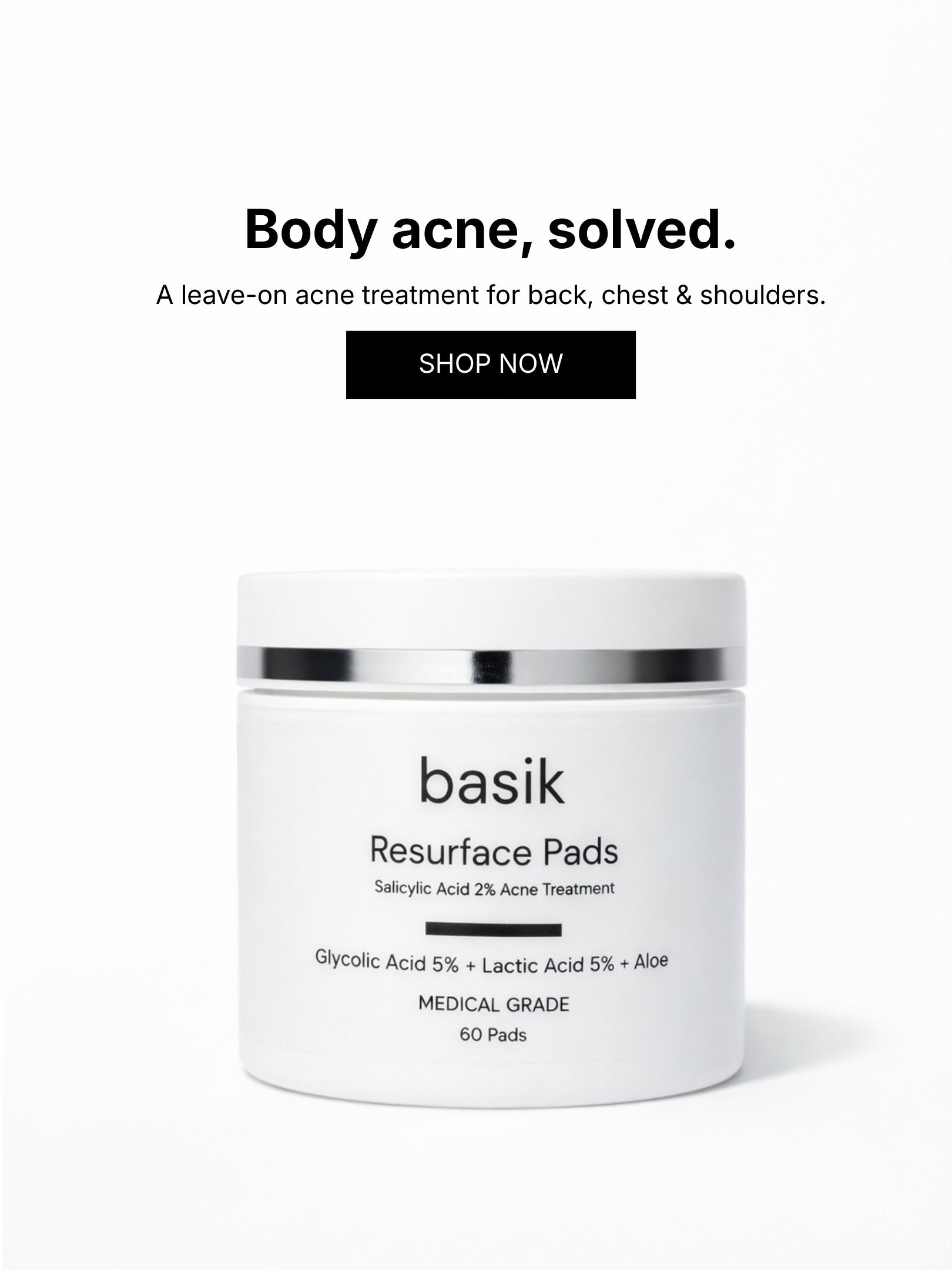 Basik Resurface Pads deliver a controlled, leave-on treatment that clears pores, smooths texture, and helps prevent new breakouts — without over-drying or irritation.